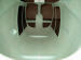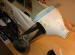 Die vom Hersteller auf dem Rumpf aufgebrachte Markierung für den Durchbruch der Abgasrohre ist zu ungenau und kann nicht verwendet werden. Deshalb wird die Turbinenmechanik zunächst exakt neben dem Rumpf aufgestellt und anschließend die Position der Durchbrüche mit Hilfe einer Wasserwaage, einem Lineal und zwei Schablonen bestimmt. Da sich aufgrund der gekrümmten Flächen kein eindeutiger Bezugspunkt für die Bemassung ergibt, zeigt sich nach dem anschließendem Ausschneiden, daß die Durchbrüche viel zu klein geraten sind. Sie werden nun in mehreren Arbeitsgängen Schritt für Schritt vergrößert. Am Ende passen die beiden Abgasrohre exakt durch die Öffnungen.
