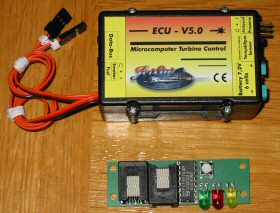 Sie wird über einen separaten 7,2 V Akku versorgt und wahlweise an 1 oder 2 Kanäle des Fernsteuerempfängers angeschlossen. Über die Interfaceplatine ist sie per GSU oder PC diagnose- und programmierfähig. Die drei LED's auf der Platine informieren optisch über den jeweiligen Turbinenzustand.