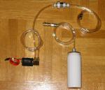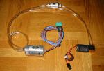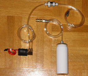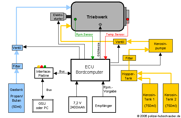 Zum Starten der Turbine wird kurzzeitig ein Gemisch aus Propan- und Butangas benötigt, welches über die Glühkerze gezündet wird. Der weisse Gastank fasst etwa 50 ml Flüssiggas, diese Menge ist für ca. 4-5 Startvorgänge ausreichend. Das Gas gelangt über einen 4mm Druckschlauch, eine Kupplungsdose (zum Befüllen) und einen Filter zum ecu-gesteuerten Magnetventil. Die ECU kann somit den Zeitpunkt der Gaszufuhr steuern.