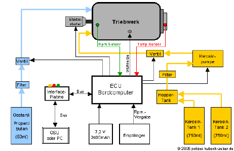Startvorgang Gibt der Pilot über seine Fernsteuerung den Befehl zum Starten des Triebwerks, beschleunigt der Elektrostarter die Turbine auf ca. 3.500 U/min. Nun öffnet die ECU das Gasventil und versorgt die Glühkerze mit Strom. Nachdem sich das in die Turbine einströmende Gas entzündet hat, beschleunigt der Elektrostarter die Turbine weiter auf etwa 4.500 U/min. Nun wird das Ventil der Kerosinleitung geöffnet und die Kraftstoffpumpe beginnt damit, Kerosin in die Brennkammer zu befördern. Während die Turbine nun durch die Verbrennung des Kerosins weiter beschleunigt, wird der Elektrostarter ausgekuppelt und das Ventil der Hilfsgaszufuhr geschlossen. Sobald das Triebwerk seine Leerlaufdrehzahl von ca. 38.000 U/min erreicht hat, ist der automatische Startvorgang beendet und die Leistungskontrolle wird dem Piloten übergeben.