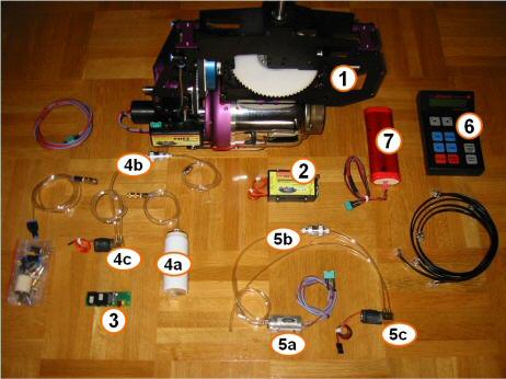 Lieferumfang: 1. Turbine m. Mechanik, 2. ECU Bordcomputer, 3. Interface für PC und GSU, 4a. Tank für Hilfsgas, 4b. Filter für Hilfsgas, 4c. Ventil für Hilfsgas, 5a. Pumpe für Kerosin, 5b. Filter für Kerosin, 5c. Ventil für Kerosin, 6. GSU (Diagnosegerät), 7. Stromversorgung 7,2 V