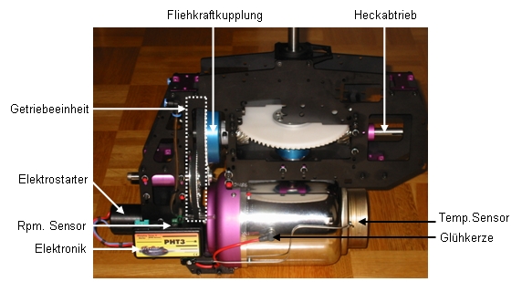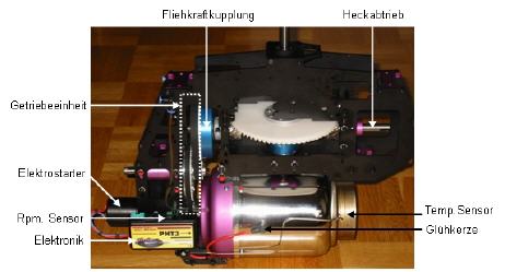 Die Turbine bildet zusammen mit der Hauptrotormechanik eine kompakte Einheit. Das integrierte dreistufige Getriebe untersetzt die etwa 100.000 U/min der Turbine auf ca. 1.280 U/min des Hauptrotors. Die Fliehkraftkupplung verhindert ein Mitdrehen des Rotors im Leerlaufbetrieb. Die Glühkerze wird nur während des Startens zum Zünden des Gasgemischs benötigt.