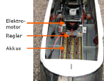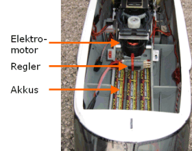 Der Elektromotor hingegen ist leise, sauber und unkompliziert, hatte bisher jedoch aufgrund der Akkutechnologie mit sehr geringen Flugzeiten zu kämpfen. Mit dem Einzug der Brushless-Motoren und Akkus höherer Energiedichte ist der Elektromotor jedoch seit einigen Jahren auf dem Vormarsch. Das Bild zeigt einen Blick in den Rumpf eines Hubschraubers mit Elektroantrieb.