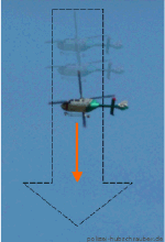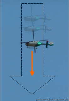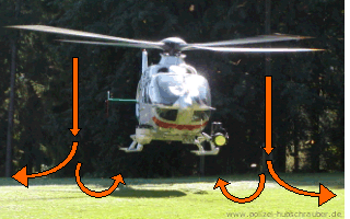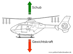 Der Hauptrotor erzeugt einen nach unten gerichteten Luftstrom (graue Pfeile) und damit eine nach oben gerichtete Kraft. Ist diese Kraft grösser als die entgegen wirkende Gewichtskraft steigt der Hubschrauber, ist sie kleiner, sinkt er. Im Schwebezustand sind beide Kräfte gleichgross.