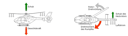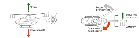 Dies lässt sich vereinfacht ausgedrückt damit begründen, dass sich der Hauptrotor zum Ausüben seiner Drehbewegung am Rumpf abstützt. Solange der Hubschrauber mit seiner Gewichtskraft auf dem Boden steht, wird der Rumpf durch die Haftreibung am Untergrund daran gehindert, dass er sich wegdreht. Sobald sich der Hubschrauber jedoch in der Luft befindet, fällt diese Haftreibung weg und der Heckrotor wird zur Kompensation des Drehmomentes erforderlich.