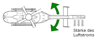 Auch bei den Heckrotorblättern läßt sich der Anstellwinkel kollektiv verändern und somit die Stärke des Luftstroms variieren. Ist der vom Heckrotor erzeugte Schub grösser bzw. kleiner als zur Kompensation des Hauptrotordrehmoments erforderlich, so dreht sich der Rumpf links- bzw. rechtherum um seine Hochachse.