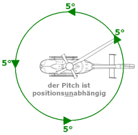 Mit dem "kollektiven Pitch" kann der Pilot den Anstellwinkel der Hauptrotorblätter einstellen. Kollektiv bedeutet, dass der Pitch während einer Rotorumdrehung stets konstant bleibt. Das Rotorblatt hat also während seines Umlaufes um die Drehachse immer den gleichen Anstellwinkel, unabhängig von seiner Position im Kreis, in diesem Beispiel 5° (siehe Grafik rechts). Je größer der Pitch ist, desto größer ist der nach oben gerichtete Schub des Hauptrotors. Bei ca. 4-5° schwebt der Hubschrauber, seine maximale Steigleistung erreicht er bei ca. 9-10°. Bei Pitchwerten unterhalb des Schwebewertes sinkt der Hubschrauber. Aufgrund seiner Massenträgheit und weiterer Faktoren reagiert er leicht verzögert auf die Steuerbefehle des Piloten.