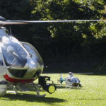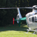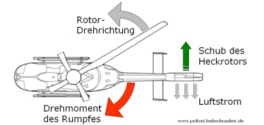 ... hingegen erzeugt einen seitwärts gerichteten Luftstrom und gleicht somit das Drehmoment aus, welches der Hauptrotor auf den Rumpf ausübt. Ohne den Heckrotor würde sich der Rumpf in der Luft entgegen der Hauptrotordrehrichtung um seine eigene Hochachse drehen.