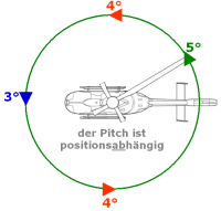 Auch der zyklische Pitch wird vom Piloten zum Aendern des Anstellwinkels der Hauptrotorblätter benutzt. Im Gegensatz zum "kollektiven" Pitch (siehe Abschnitt oben) erlaubt es die "zyklische" Blattsteuerung den Anstellwinkel eines Rotorblatts abhängig von seiner jeweiligen Position im Kreis einzustellen. So ist es z.B. möglich, dass das Rotorblatt beim Überstreichen der Rumpfspitze einen kleineren Anstellwinkel aufweist als beim Überstreichen des Hecks. In der Grafik (unten) ändert z.B. das Rotorblatt bei jedem Umlauf seinen Anstellwinkel zyklisch zwischen 3° und 5°.